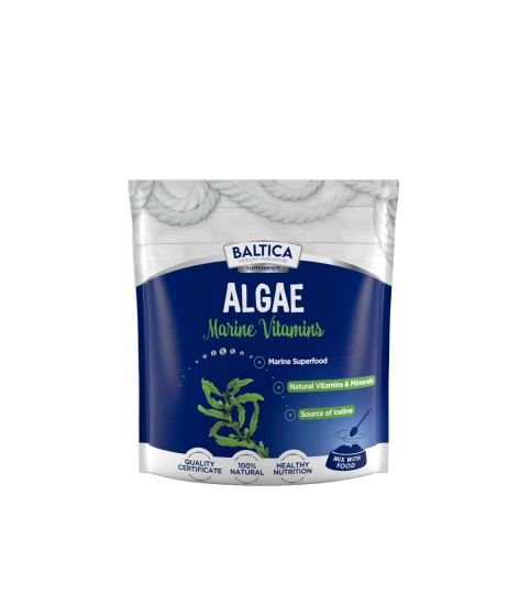 Baltica Algi dla psa i kota to suplement diety, zawierający wysokiej jakości, ekologiczne algi morskie, których spożywanie niesie za sobą szereg korzyści dla zdrowia Twojego zwierzęcia. Algi morskie wspomagają między innymi pracę tarczycy, dzięki czemu układ hormonalny zwierzęcia może pracować bez przeszkód. Dodatkowo poprawiają kondycję skóry i sierści oraz pozytywnie wpływają na układ trawienny i możliwości prokreacyjne. Co istotne – dzięki wysokiej zawartości cennych składników odżywczych, algi są jednym z najczęściej rekomendowanych suplementów dla zwierząt, polecanym przez holistycznych weterynarzy.