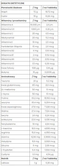Skład tabletki: drożdże browarnicze (Saccharomyces cerevisiae), fosforan dwuwapniowy, węglan wapnia, mączka z alg (Ascophyllum nodosum), ekstrakt z dzikiej róży, krzemian mineralny, dodatek witaminowo-mineralny.